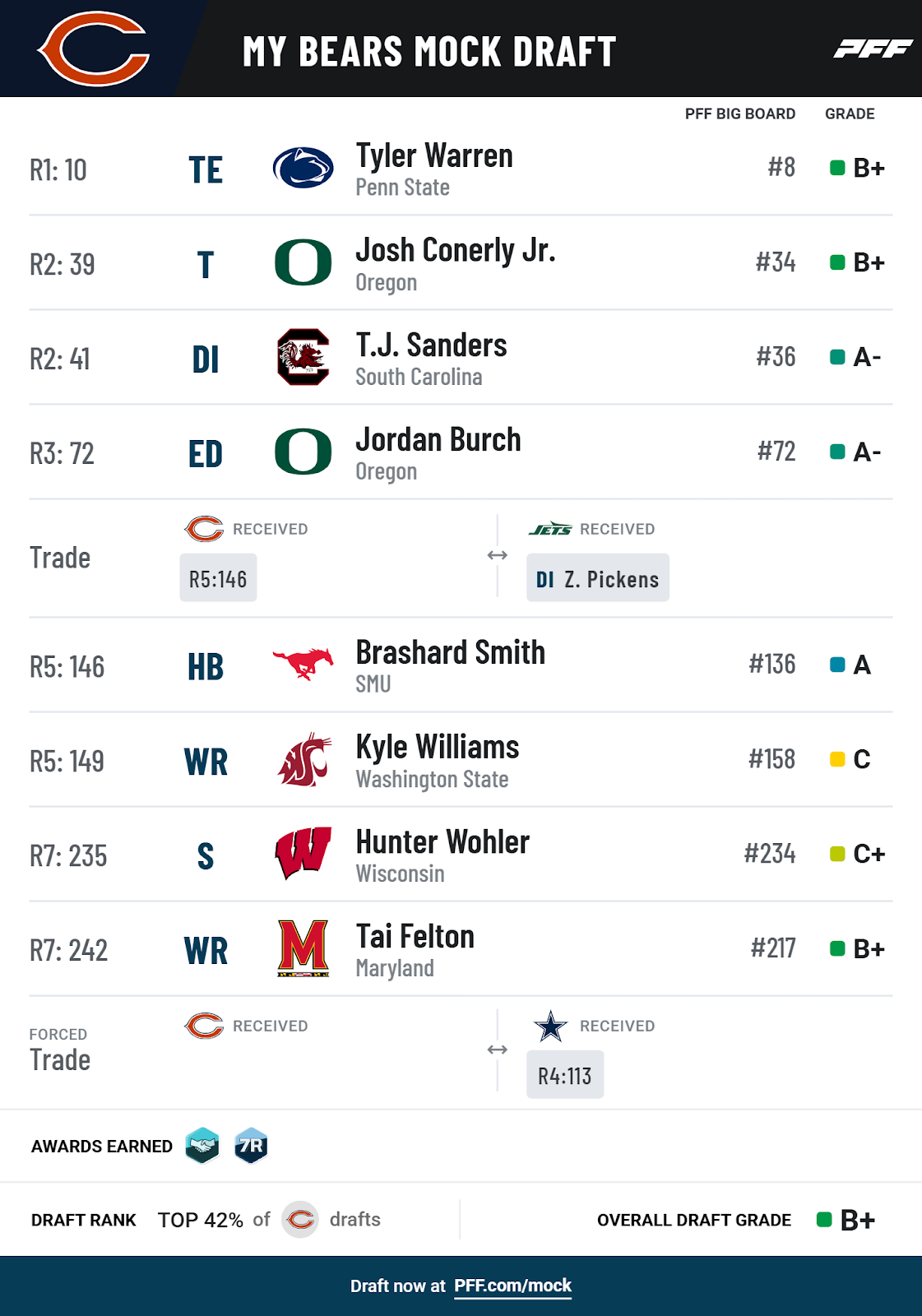 There is a lot to like here. Caleb Williams had a terrible debut game, then improved significantly before the entire team was shellshocked by the Hail Mary loss. He made a boatload of plays in three straight divisional one-score losses, suggesting that he's got the right demeanor to persevere. Williams looks at home, in his element, on the football field. Having both Case Keenum and Tyson Bagent backing him up provides a competent QB option at all times.